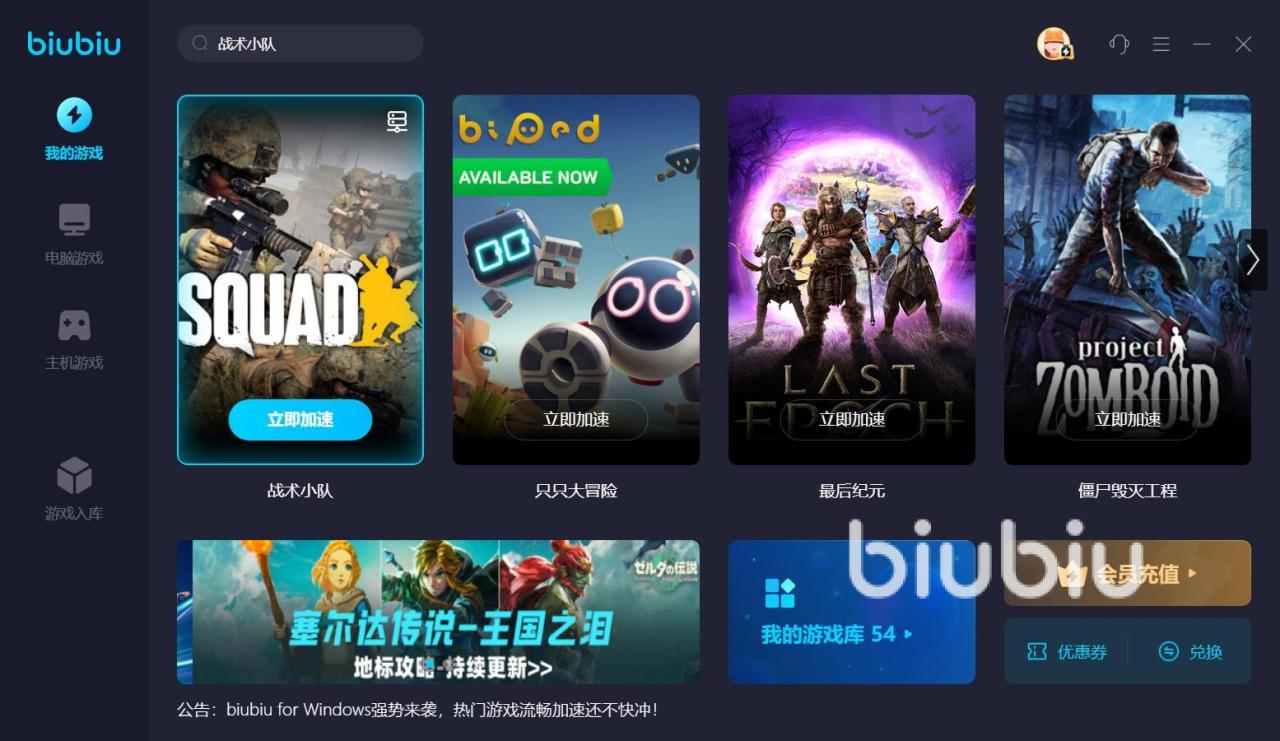 如果不是设备老化,满足不了配置要求的话,那就有可能是网络出了状况,你可以去重启路由器,或是使用biubiu加速器,去解决这类情况,如果你想用加速软件处理的话,首先要做的,就是在应用当中,检索到该游戏专属的加速入口,并将其添加到主界面,最后点一下游戏图标上的立即加速就可以了。