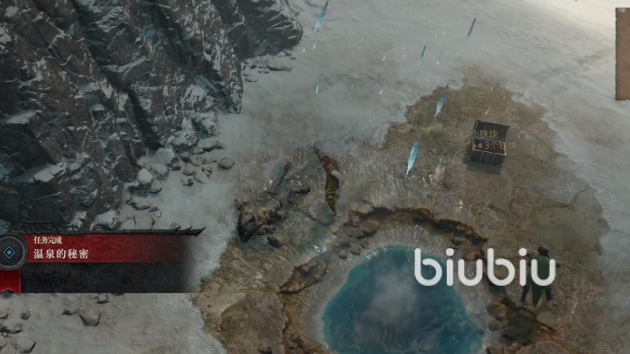 然后来到地图北侧的位置,这个地方非常容易找到,有一小片水域,就是密语中的“大自然的恩赐”。地上有着一些怪物尸体,除此之外什么都没有。这个时候,我们打开表情列表,点击等待的表情,然后在温泉上方不远处就会出现一个宝箱,这个任务就完成了。