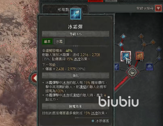 往右下方走,找到冰霜新星这个技能,这里注意这个技能需要点满,因为这是第二重要的招式。因为我们需要用它来触发附魔槽的寒冰裂片的被动释放。它的强化急速冻结在没有冰霜新星的时候,利用它可以有更高的概率可以冻结敌人,只要一冻结就可以触发被动寒冰碎片,所以这里也需要将它点满。