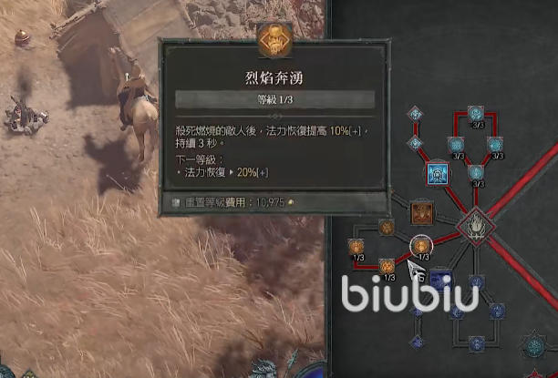在选择大招方面,我们向左找到极度冰冻这里点亮它,可以将它作为一个保命技能,旁边的两个强化点亮后可以缩短它的冷却时间。在它的下面有一些小的强化技能,找到烈焰奔湧,顺着它连带着点亮左边的两个强化,而之所以要点亮这三个强化是因为要加强火焰弹的伤害。