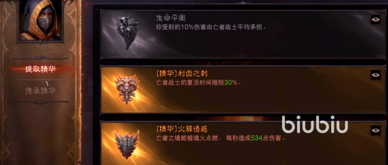 武器传承技能是在精华传承商人处,点击精华传承,会显示两个功能,第一个是提取精华,点击就可以看到我们背包中装备,其中装备中比较好的词缀就会显示出来,比如免疫所有击退效果,暗黑诅咒持续时间延长等属性。可以将传说装备上的属性提取到商人初,进行保存,当然提取是需要金币的。