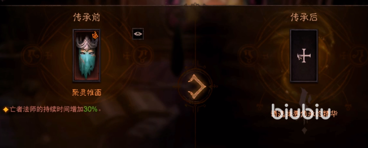 第二个功能是传承精华,点击后会将现在穿戴的装备放在左边,右边则会显示可以传承的精华,点击加号,就是我们之前储存在商人处的属性,选择想要的进行替换即可。