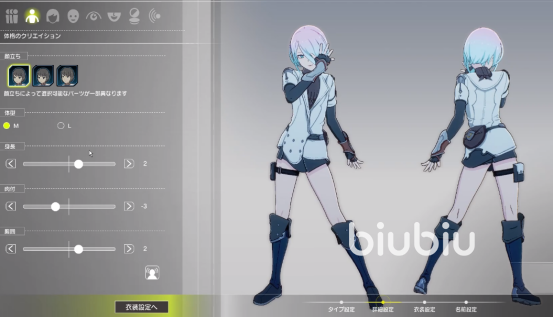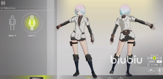当我们第一次进入游戏时,在游戏的左上方会有性别选择的按钮,可以让玩家选择男性或者女性,点击第二个就可以建立女性角色了。然后再点一下下方的衣装设定按钮,第一个选项是为某些不想自己设计角色形态的玩家准备的整体形象,可以在此基础上进行微调。第2个是调整整体身高比例的界面,在这里玩家可以选择自己游戏内角色的身高,体态等外形。