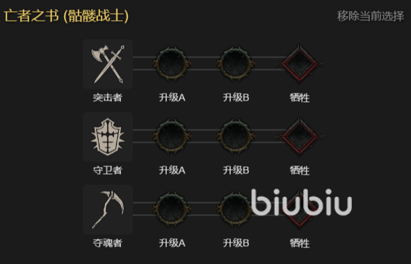 亡者之书,激活后,会增加一个复生骷髅的技能,点击就可以召唤出仆进行战斗。并且可以同时最多签订3个骷髅仆从,分别是战士、法师和傀儡。每一个都延伸出了3种专精,战士的为突击者,守卫者,夺魂者,每个选项还有3种不同属性的加成,玩家只能选择一个进行激活,比如选择了突击者的升级A,可以多召唤一个骷髅战士,就不能在选择夺魂者的升级A,攻击debuff状态的敌人,减少回旋攻击的冷却。同样的,法师、傀儡也只能各选一个加成,总共可以选择3个,根据自己bd的情况选择合适的来生效。