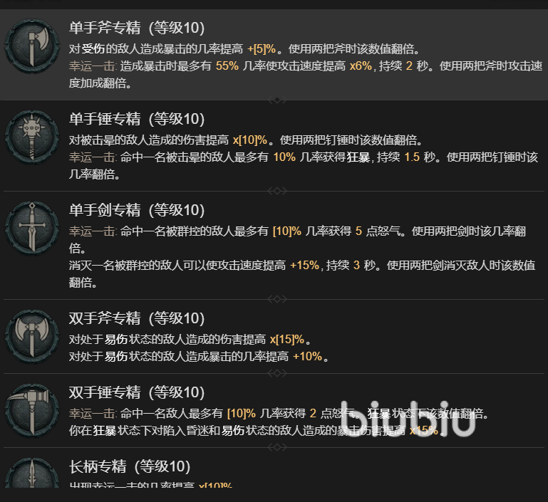 武器专精,野蛮人之所以强大,就是其独特的职业设定,让他可以使用4把武器,而武器专精是为我们主武器进行服务的,玩家可以在单手锤、单手剑、双手锤、双手斧、双手剑和长柄中选择一个专精进行赋能。比较推荐玩家根据游戏内数值最高的武器进行挑选。当然为了能顺畅游玩暗黑4,一款好用加速器必不可少,大家可以试试biubiu加速器,一键加速,且针对新人注册还可以免费使用3天的会员加速服务哦。