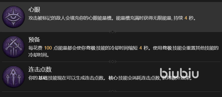专精,相比其他职业的复杂选项,游侠只需要三选一,分别是心眼,预备,连击点数。心眼是攻击被标记的敌人,会补充能量,当能量槽蓄满时可以无限能量,持续4秒。预备则是花费一定能量可以减终极技能的cd,连击点数则是使用基础技能可以生成连击点数,核心技能会消耗,从而获得加成。