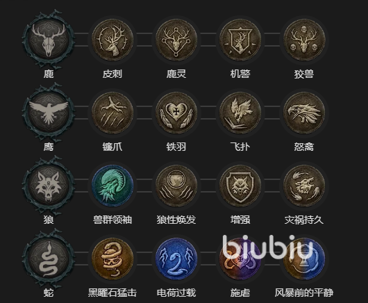 灵物恩惠,总共有4种灵物,分别是鹿、鹰、狼和蛇。每一个圣灵中都有4个选择的加成。但是每种圣灵最多选择两个恩惠,比如选择了狼灵的造成伤害,有概率恢复灵力的狼性焕发和延长终极技能时间的灾祸持久,还可以在剩下三个中点出2个恩惠。当我们解锁了4个恩惠后,可以和他们签订契约,这样就可以多激活一个灵物的恩惠了,也就是说德鲁伊最多可以有5个恩惠加成。