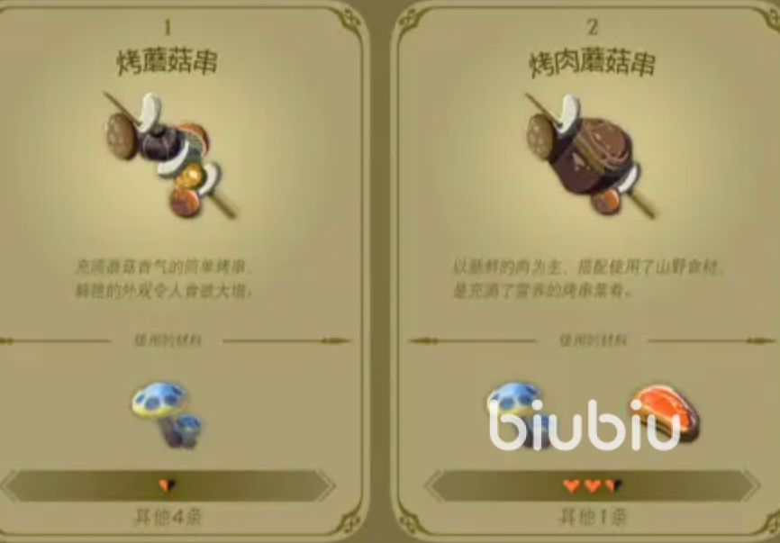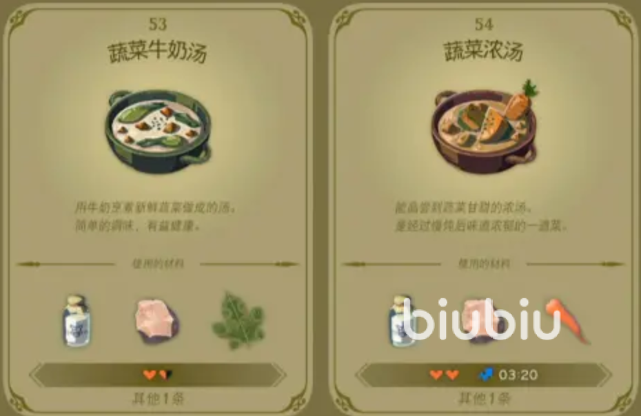 游戏中的制作材料分为3种,分别是食材、调味料和活物类。食材就是日常可以获得的各种水果,蔬菜,蘑菇,肉类,比如可以采集到的苹果,速速蘑菇,南瓜,以及通过捕猎获得的兽肉。调味料就是一些香料、添加剂,比如岩盐,大蒜,蔗糖等等。当我们制作食物时,加入这些调味料是有一定概率大成功的,而这个大成功可以提高回复血量的数值,并且增加持续作用的时间。活物类就是除了鱼类,肉类之外的肉食,比如暖暖蜻蜓,贴贴蜥蜴,精力蚂蚱等等,这些食材前面都会有词条,制作的食物会有附加效果。
