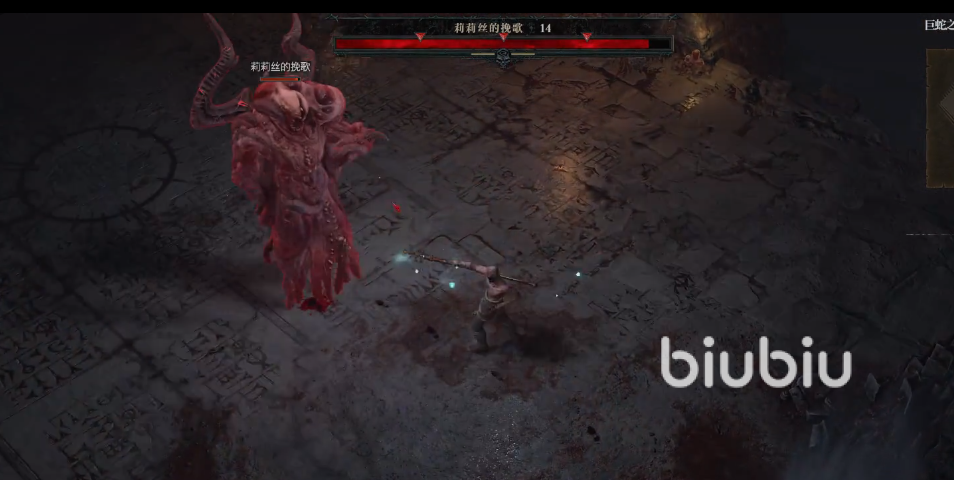 先是跟随游戏任务要求,深入地下追寻莉莉丝的踪迹。来到巨蛇之道这里,就能看到莉莉丝的挽歌了。玩家需要绕着挽歌走位,同时不断释放技能。因为前期的伤害比较低,所以需要花费一点时间。
