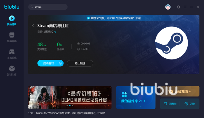 这几年关于steam网络方面的诟病越来越多,大家在使用的过程中也会比较频繁地遇到账号登录需要长时间等待、商店界面卡顿、社区无法进入等情况,所以对于大部分的“骨灰级”使用者来说常备加速器或许已经成为了公认的选择。近期steam客户端推出了更新,风格更加扁平化,但是关于界面卡顿的问题一直没有得到改善。今天小编向大家推荐的biubiu加速器,就带有针对steam平台的多种加速功能。