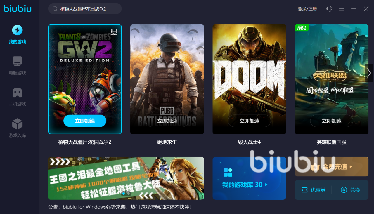 想必大家看了小编的介绍之后,对于电脑植物大战僵尸闪退什么情况,应该有了一个大概的了解了,下载方式跟使用操作都没有任何的难度,快速入口已经放在上方图片下方了,直接点击就能够安装,根据你需要的版本选择就好了,登录就可以搜索你想要加速的游戏,需要的伙伴们快点行动起来吧。感谢大家的观看,更多的精彩内容也可以登录biubiu官网查看哦。