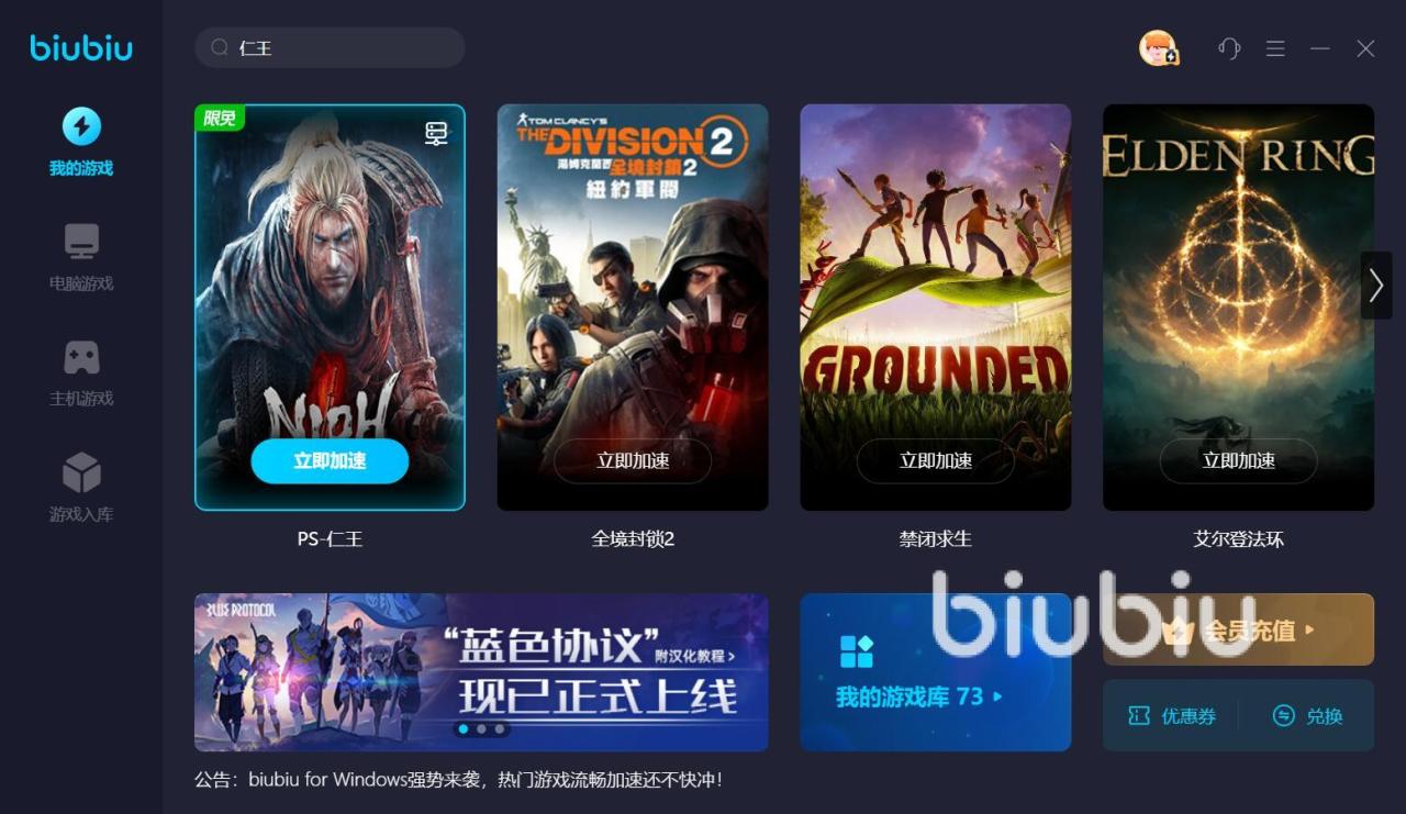 仁王包含了常世同行和萍水相逢两种,两种模式下,判定胜利的机制是不一样的,但无论是哪一个玩法,都需要靠谱的网络作为基础,否则实际的体验,将会大打折扣。想要保持稳定流畅的网络环境,可以去使用biubiu加速器,帮助你解决问题。目前,软件为这款游戏的ps版,提供专业的加速服务,大家想要开启这个功能,先要做的,就是利用检索功能,定位到加速入口,并添加到主界面,方便之后操作。之后,点一下立即加速,这个服务就正式运行了。