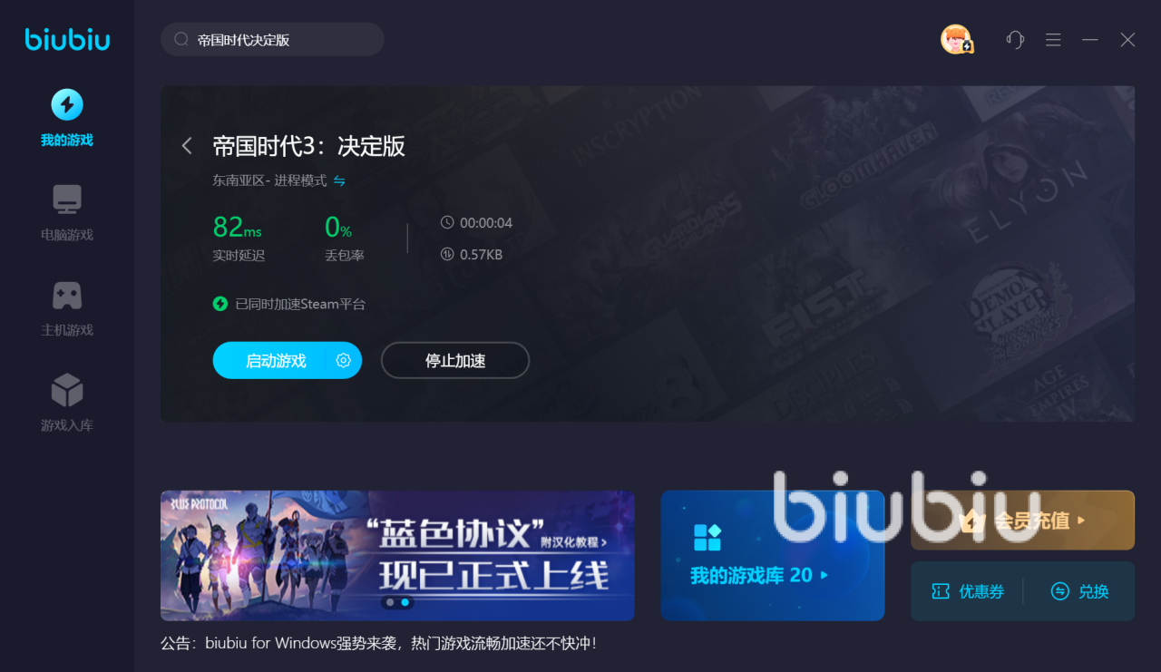 以上就是帝国时代决定版闪退用什么加速器好的全部内容,想要解决闪退就先从根本的延迟出发,而加速器的选择也相当重要,biubiu加速器能提供给用户的综合服务有特别多,尤其是在延迟优化这一方面更是佼佼者。
