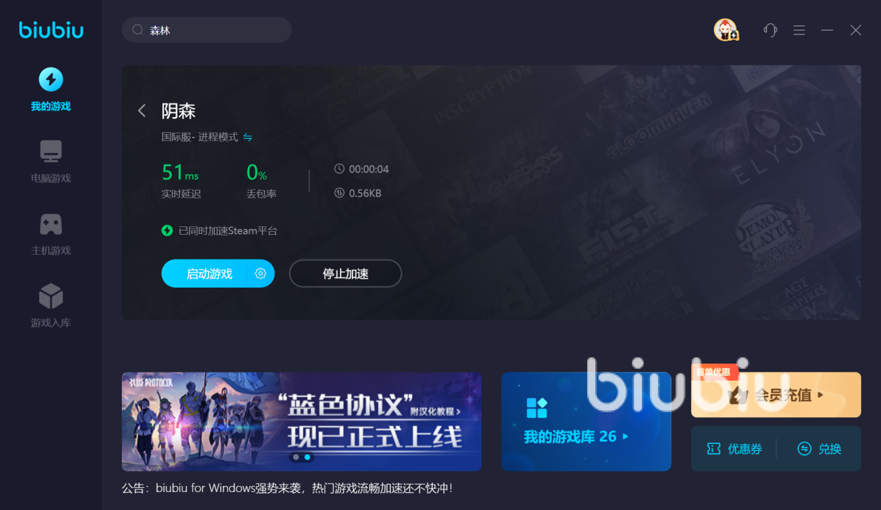 推荐biubiu加速器因为它始终是将用户体验放在首位,就比如软件界面设计的很简介,所以游戏只要能搜索到点击封面就能进行一键式加速,搜索引擎的搜索速度也很快,是可以通过模糊关键词来定位到游戏的,就比如在biubiu加速器里输入“森林”它就会自动将阴森这款游戏也呈现出来,对于其他游戏来说也一样,只要输入这款游戏的“代号”或是相关的叫法就都能搜索到,在定位到之后即可开始加速体验。
