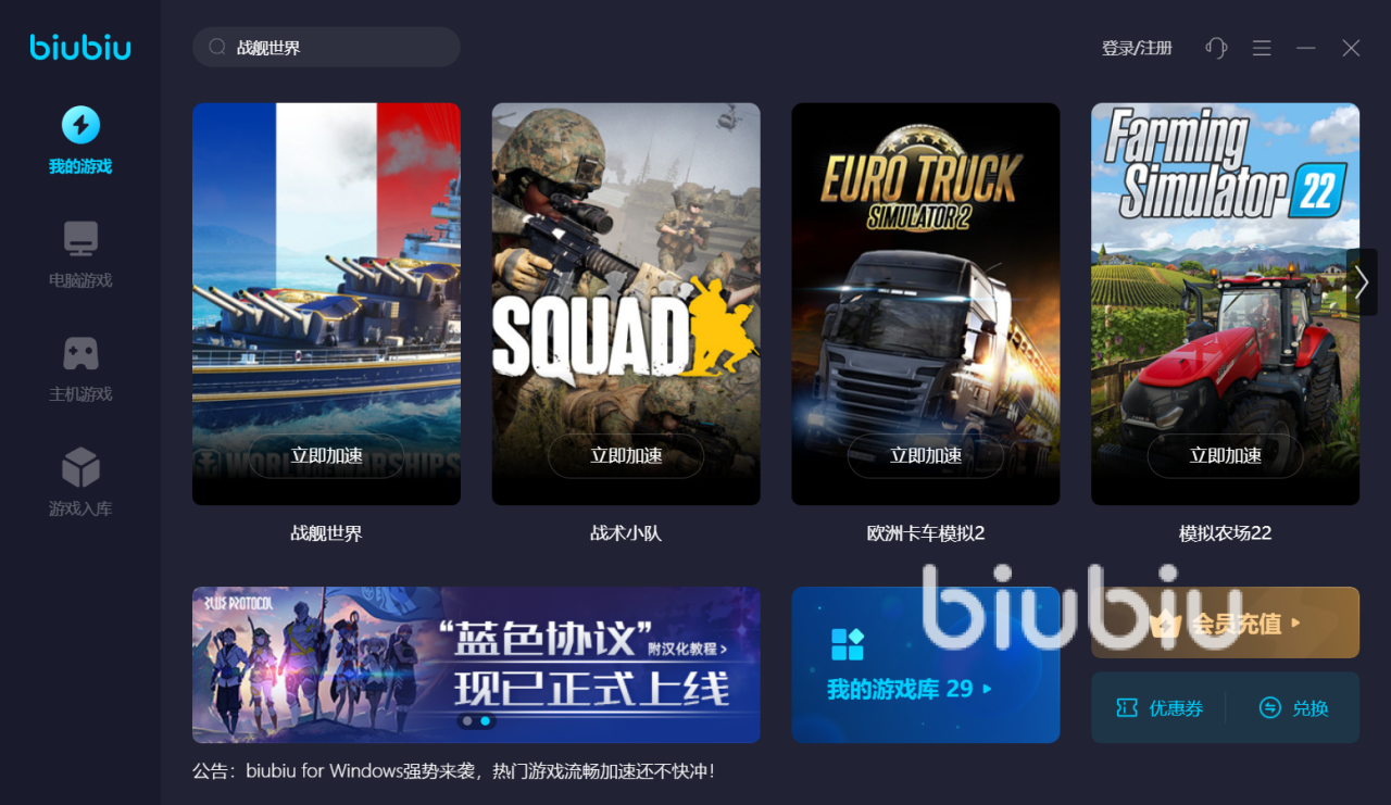 今天分享了战舰世界进不去卡在登陆界面的具体攻略,玩家们按照以上步骤操作即可,体验biubiu软件的强大之处。它轻松优化网络,整合优质资源,实现高效率提升网速,从而完成快捷网络协议数据传输,避免高延迟与数据中断等。