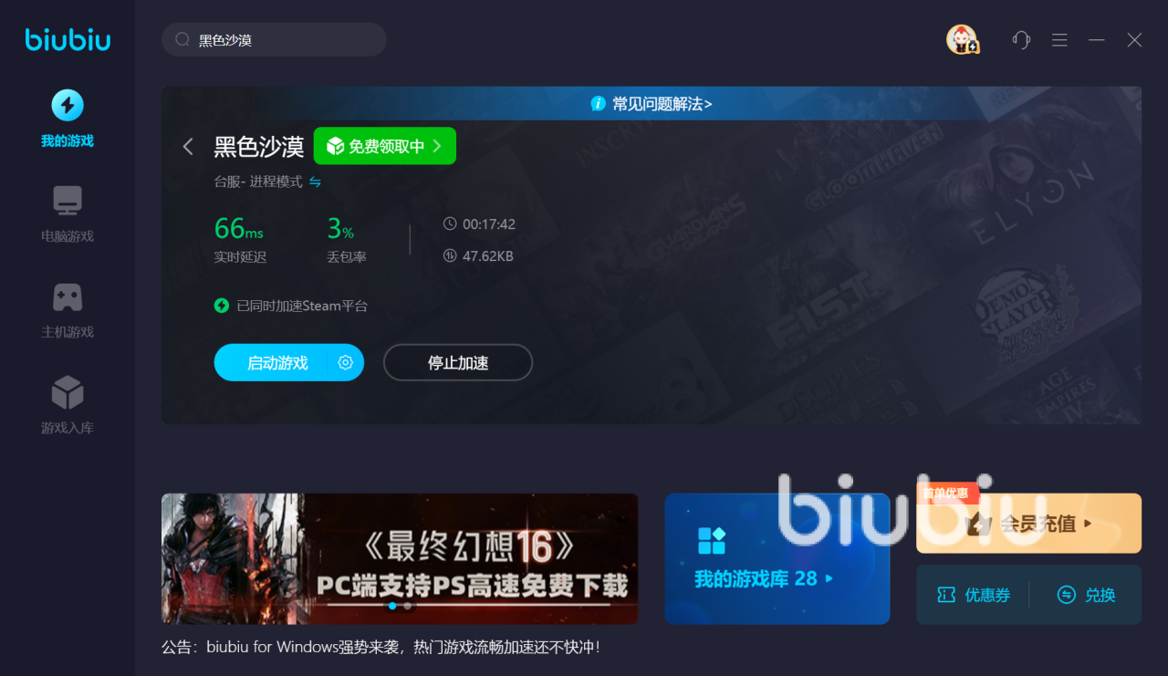 黑色沙漠在除了pc版本之外还有开设的XBOX版本,在搜索定位的时候也只需要输入一次“黑色沙漠”就能找到,可看到XBOX版本属于限免阶段,拥有同等待遇的还有各种主机游戏以及国服游戏,所以这属于是在biubiu中能享受到第一重福利,而第二重的话则是新用户的免费会员三天领取啦,本来在biubiu里就没有影响观感的广告植入,平台还愿意拿出各种限免和免费的活动出来,在这一点上真是能秒杀许多加速器。