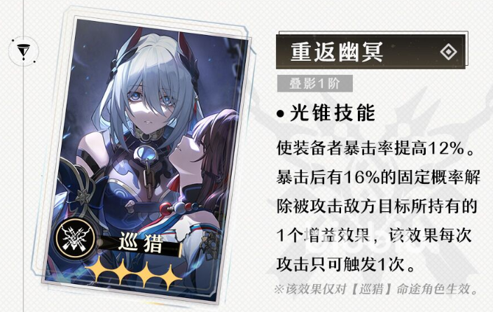 巡猎祝福下的角色往往需要承担主要输出,所以重返幽冥效果也还算可以,增加暴击几率和解除对手的buff增益,不过由于这个命途下目前强的只有希儿,但她对于速度的要求也很高,毕竟回合制讲究“拉条”的嘛,高速更容易插队各种追加攻击,所以目前来看这个自选光锥着实一般。