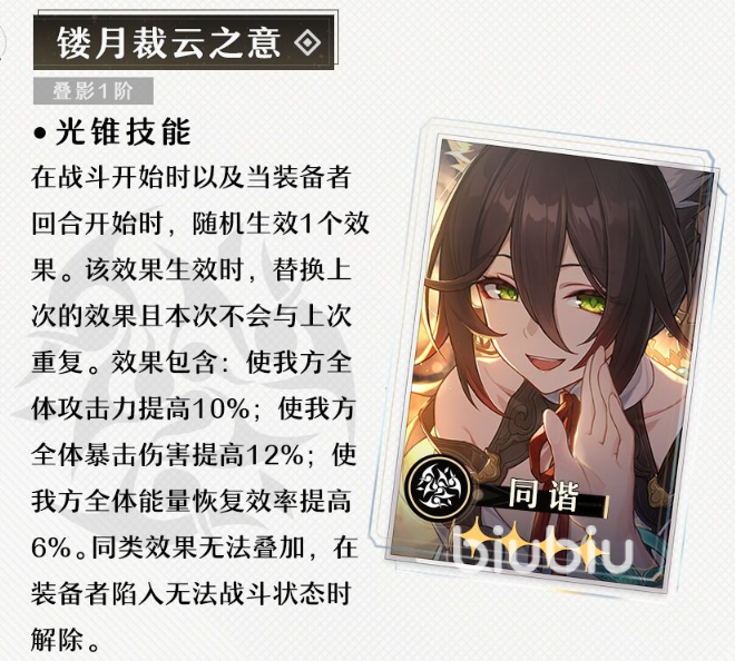 这个勋礼其实就是一般人所说的版本通票,你需要花钱去开通才行。里面有很多奖励其中包括四星光锥七选一,对应了不同的七个星神祝福。镂月裁云之意可以让同谐命途角色进行使用,可以随机上buff效果直到装备者倒下才会解除增益,因为这个效果模板和《原神》中的“流浪乐章”几乎是一模一样,所以在这里同样可以作为首选。
