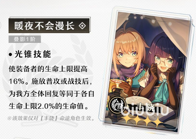 暖夜不会漫长是标准的丰饶角色不可或缺的武器,这个命途下都是治疗角色并且很吃生命值,所以只要你带了奶妈那么肯定能用的上,加自身血量上限以及普攻和战技给全队回血,保证队伍续航非常用帮助。
