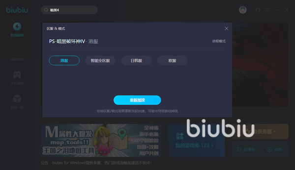 暗黑4的区服设定比较特殊,任何一个区服能够体验到的内容是一样的,而且账号数据是互通的,所谓的区服其实就是网络入口有差别。也就是说,我们不管是选港服还是选日服,对于游戏体验来说只有网络方面有一定区别。如果大家有固定游玩的区服,可以直接在biubiu中选择,或者干脆选择智能模式,软件就会根据当前各个区服的连接情况来自动选择,从而保证连接的速度和稳定性。