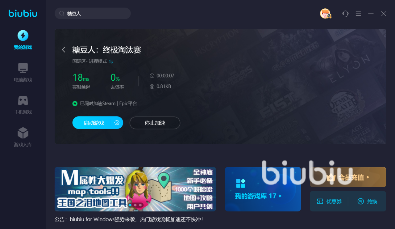 不过由于实时PK一局需要匹配60个人,很多玩家都会反馈匹配时转圈非常卡,而且匹配速度也比较慢,如果玩家是4人组队,有些伙伴还容易被卡掉线,让这款魔性合作游戏的乐趣大打折扣。那么,针对这些问题,小编极力推荐大家使用biubiu加速器,加速指定游戏还能同时加速Steam、Epic平台,现在新人注册可享免费加速3天哦!