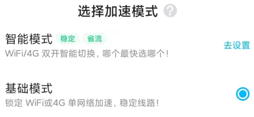 与此同时,多种加速模式也可以让用户们自行调整。系统在默认的情况下,为大家提供的是基础模式,针对无线网和4g都有很好的效果。但想要节省切换时间的各位,也可以考虑使用智能模式,整体来说为大家节省的流量会更多,无线网的情况下也会让加速更有效率,线路也自然更稳定。