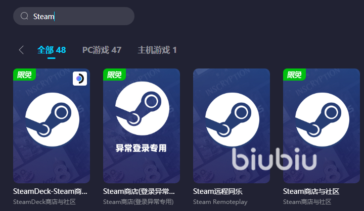 如果大家有去对比过就能发现,免费试用时间这么长的工具真的不多,大部分都是只有一个小时,或者是看广告获得免费时长,但是看个40秒的广告只给5分钟的体验机会,也就登陆一下,试用的机会就没有,非常的不实用,而biubiu上面也说了,有超长的试用期限,同时针对国服的游戏它还有着限时免费的加速服务,就这一点来说,小编认为是非常良心的,重点就在于大家使用的时候非常的方便,直接去点击文中链接就能去安装解锁了,然后搜索steam,就能为它开启加速服务。