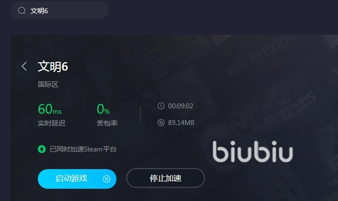 biubiu加速器是一款专业做游戏加速的软件,一些新手玩家在加入文明六多人模式时会出错,或者在创建房间时卡顿掉线,那么九成是因为联网的环境不行。先点击上方的链接下载正版的biubiu加速器,按照系统提示使用手机号注册登录与实名,快速拥有属于自己的账号,支持多端平台通用。接下来首页上搜索文明六,点击一键加速然后启动,这款游戏就自动加入游戏库里,还能在游戏过程中实时看到加速的效果。