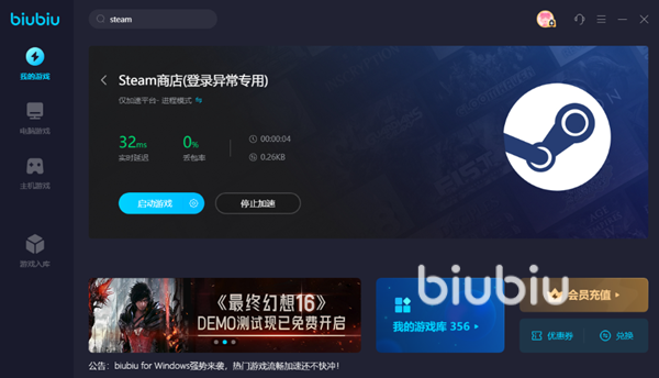 在开启biubiu的网络修复功能之后我们可以看到具体的实时延迟降低效果,但是数值的短距离波动对于steam平台本身来说没有多大的意义,只要是成功加速,对应的网络故障基本都会被修复。比如我们使用了登录异常专用的修复功能,此时启动steam就会发现已经可以正常登录了,而且是网页端和客户端通用,一并解决。在登录完成之后停止加速,再选择对应的游戏加速开始游玩就可以了,十分简单。