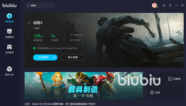 这款工具使用了业界顶尖的游戏加速技术,能够帮助大家提升网络连接速度,而且支持的游戏也十分全。进入软件之后大家可以在左侧看到区分了电脑游戏和主机游戏的库,针对不同的玩家带来别样的服务。更加令人惊喜的是,大家会发现biubiu加速热门的主机游戏都是不收费的,其实有一些国服游戏也是可以免费加速,不得不说真的太良心了。大家在软件中搜索战地1的话,就可以看到囊括了目前推出的所有版本,而且也带有系列的其他热门作品可以加速。