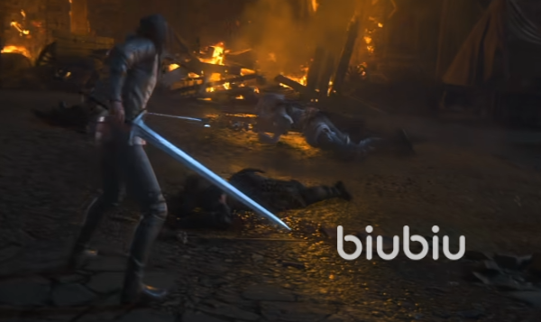 在我们切换成主角进到了当前的火场时,见到了正在肆意杀人的骑士,这里与跟班先将士兵和占卜师清理掉之后就会进入到动画。视角会突然看向天窗,在城堡的顶处站着一个拿着长枪的帅气骑士,它就是BOSS辉耀龙骑士。他从空中跳下来的时候,我们先按下R1键进行躲避,等他落地后先冲刺过去架住他的第一招。