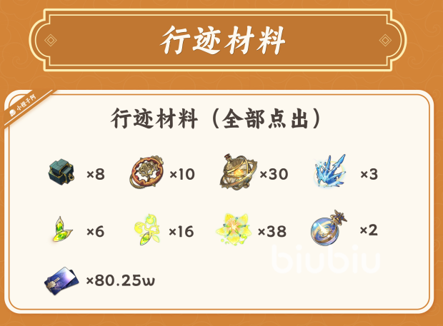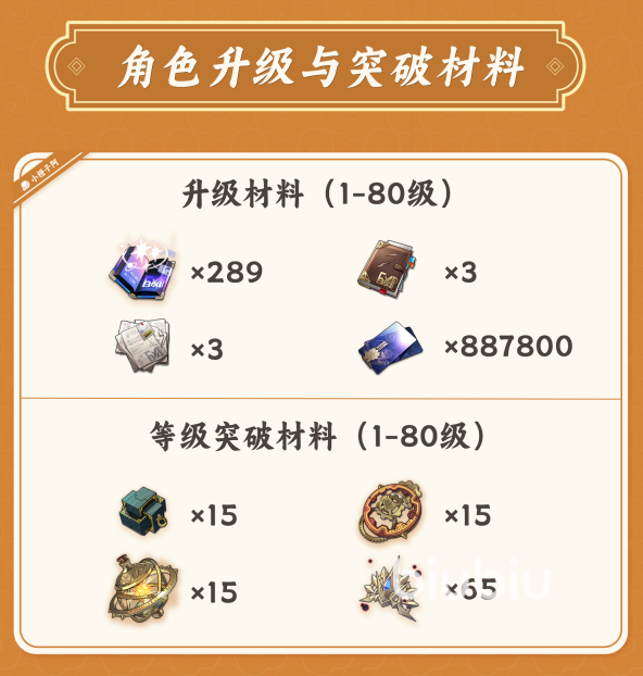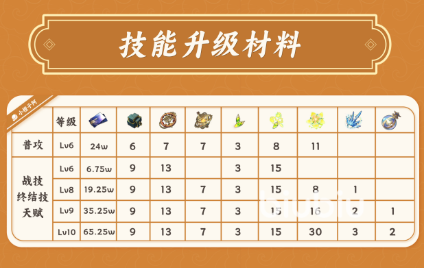 而有关他的升级和技能材料小编就不再赘述了,你可以根据图中的表格一眼就看明白。除此之外遗器的使用也是非常重要的,目前环境下只能带云无留迹的过客这一套,不过作为“奶爸”的他有些不同,使用的乘区不是传统的生命值加成,而是攻击力转治疗,所以在词条选择上优先考虑治疗效果加成,以及百分比攻击和元素充能恢复,其余的词条基本上没什么作用。
