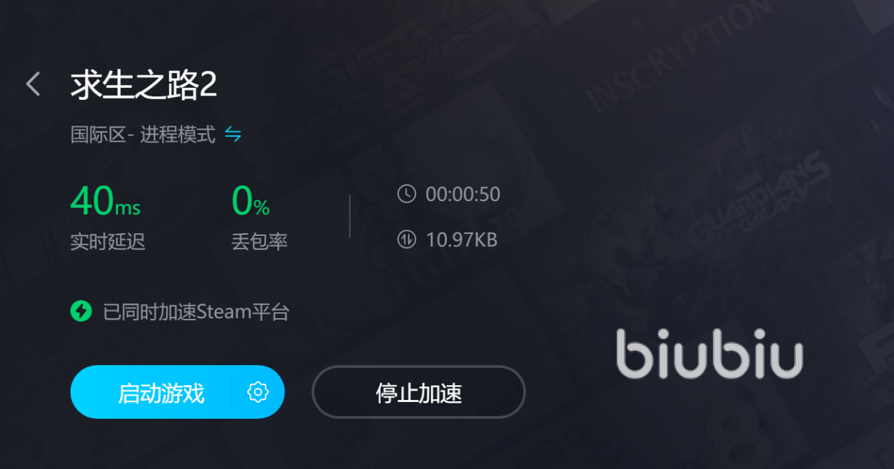 Biubiu不仅功能多,运行的速度也很快,在小伙伴们从biubiu打开求生之路2点击启动的时候,biubiu就直接跟着启动了,一个按钮,直接启动两个软件工作,非常简化。并且小伙伴们可以看到求生之路2游戏的网络状态是很好的,延迟率也非常的低。