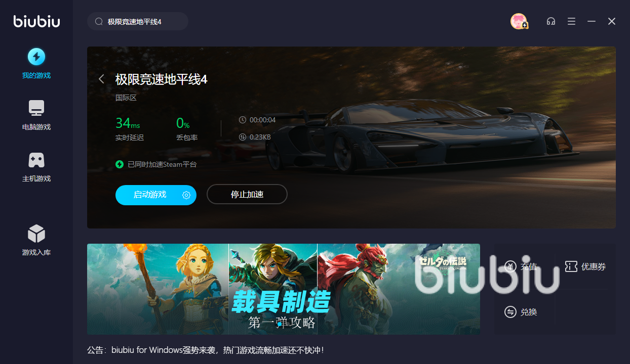 至此,有关地平线4为什么会闪退的话题就结束了,闪退也不是什么大不了的问题,不止地平线4这一个游戏会出现,一个加速器就完全可以解决,加上biubiu涉及的游戏范围很广,所以绝大部分游戏小伙伴们都可以在上面搜到,非常适合喜欢玩端游的小伙伴们长期使用。