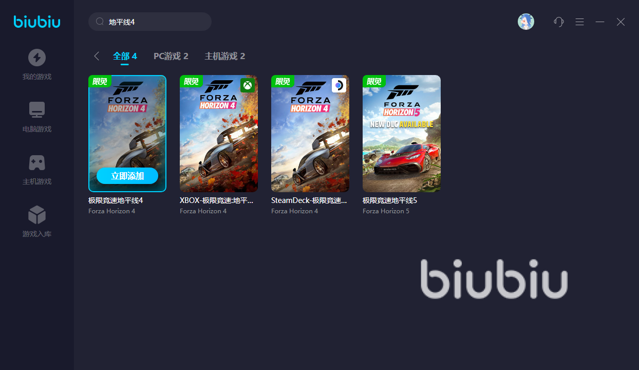 在biubiu的平台里面,游戏是非常多的,凡是小伙伴们能在biubiu里能搜到的游戏,它都可以服务,其中就包括了地平线4。小伙伴们只需要下载好biubiu输出地平线4就会弹出来游戏啦,然后把游戏添加到自己的游戏库里,因为后期地平线4游戏需要小伙伴们从biubiu打开才行。