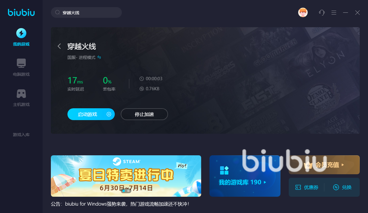 不过网络要是不给力的话,那么大家在体验的时候就会遇到掉线或者是延迟很高,射击指令半天发不出去的情况,所以这个时候就需要大家用到相关的加速类工具来帮助自己了,其中biubiu作为一款游戏加速类软件,能够有效的帮助大家去稳定网络,尤其是它的专线加速支持,能让玩家的网络快速得到优化,根本就不需要担心会发生掉线的情况,同时对于穿越火线这类国服游戏,平台目前也是给到了大家限时免费的福利。