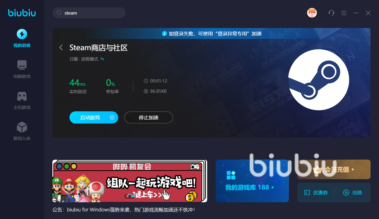 2023年07月03日 14:47 来源:冰雪正梦幻现在体验游戏也是成为了人们休闲娱乐的重要项目之一,而其中steam作为全球化的游戏平台之一,自然也是受到了许多玩家群体的关注,今天小编主要是和大家介绍下steam要用加速器吗,如果说自己在体验该平台游戏时,出现了无法登陆或者是掉线卡顿情况严重时,那么为了能有效优化网络,肯定是需要去使用加速器的,其中以biubiu加速器的各方面表现都算不错,所以朋友们要是感兴趣,那么就一起来看下吧。