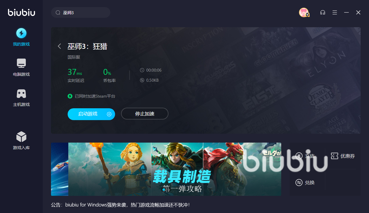 虽然下载了biubiu,但是并没有增加小伙伴们平时玩游戏的操作难度,因为小伙伴们不需要分开启动biubiu和游戏,而是直接在biubiu里打开巫师3游戏选择启动就好了,将两个软件绑在一起直接一块启动,方便biubiu加速。而且还有一个很好的消息是,新人小伙伴们下载biubiu还会有免费三天的会员赠送,这可是白嫖的福利,怎么可以错过呢!