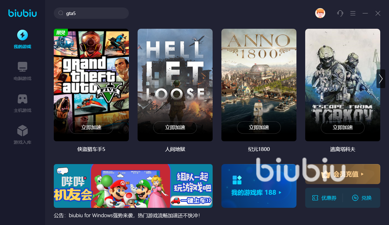 小编也是知道大家对于这款游戏非常喜欢,如果加速器的使用很麻烦的话,那么肯定也是不行的,所以biubiu把界面设计的很是简洁,主要的功能都是在左侧之中体现,玩家可以在里面直接去搜索想要去开启加速的游戏,然后再去点击蓝色的立即加速按钮即可,在这些步骤都完成以后,工具也会第一时间为大家去建立对应的加速通道,要知道现在去下载的话,新用户可是有着72小时的免费试用机会,同时国服的一些游戏也是有着限时免费福利的哦。