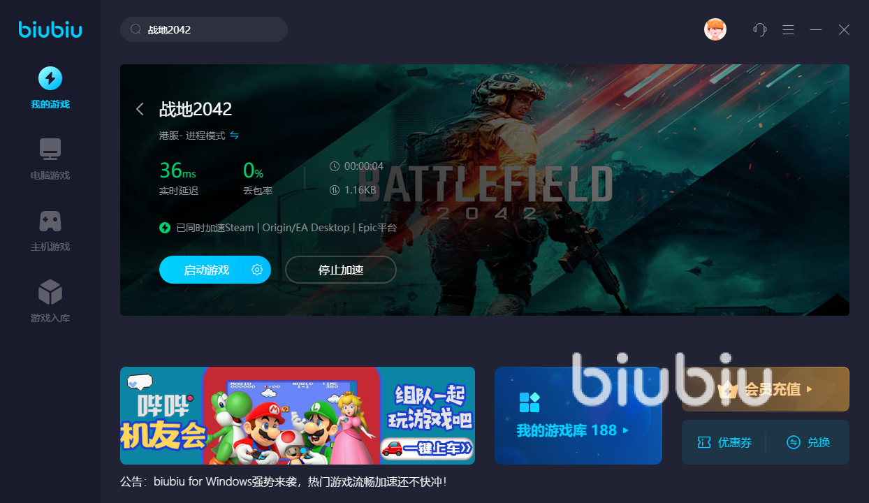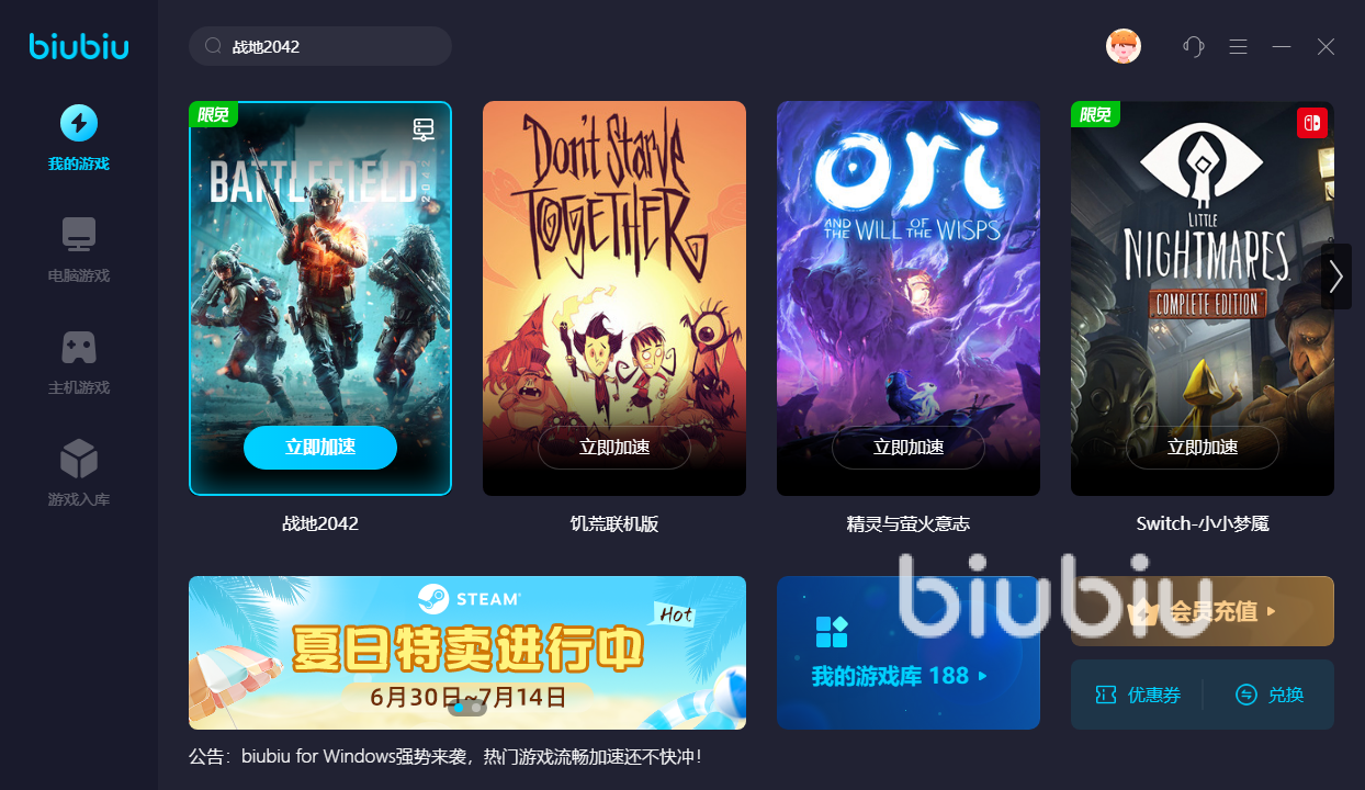 考虑到有很多新人用户是第一次去使用加速类工具,如果界面太过复杂的话,肯定是不行的,而biubiu的这款加速工具让人看起来就非常的舒服,主要的功能都是在左侧进行了展示,玩家可以在游戏库里面发现各类不同的游戏,这个时候直接去查找就可以了,然后点击开启加速,就可享受它带来的服务,根本就不需要担心会有掉线的情况发生。