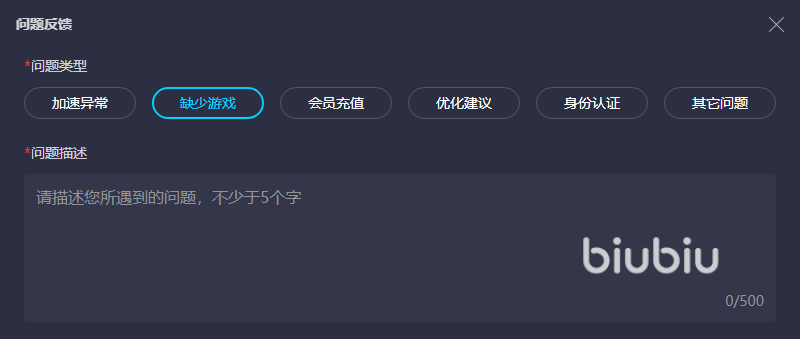 不过,考虑到很多玩家在玩游戏的时候,会偏向于一些非常冷门的作品,如果大家在biubiu加速器内没有找到的话,可以通过问题反馈的方式来让平台直接解决,处理完成之后大家就会发现相关游戏已经得到了支持,这一点也足以正面平台非常在意玩家的游戏体验,不仅满足基本的网速优化,也为各位的稳定体验带来了保障。