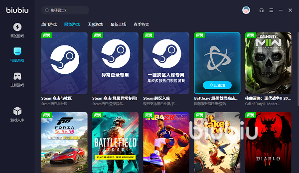 这个软件中有很多游戏的加速是限时免费提供给大家的,我们可以在游戏库中选择“限免游戏”看到,其中除了一些针对游戏平台功能的修复服务之外,还带有一些主机游戏和国服游戏,可以满足很多玩家的不同需求。而且就算是主机玩家,也可以免费试用biubiu来进行加速,这在加速器产品中还是比较罕见的。