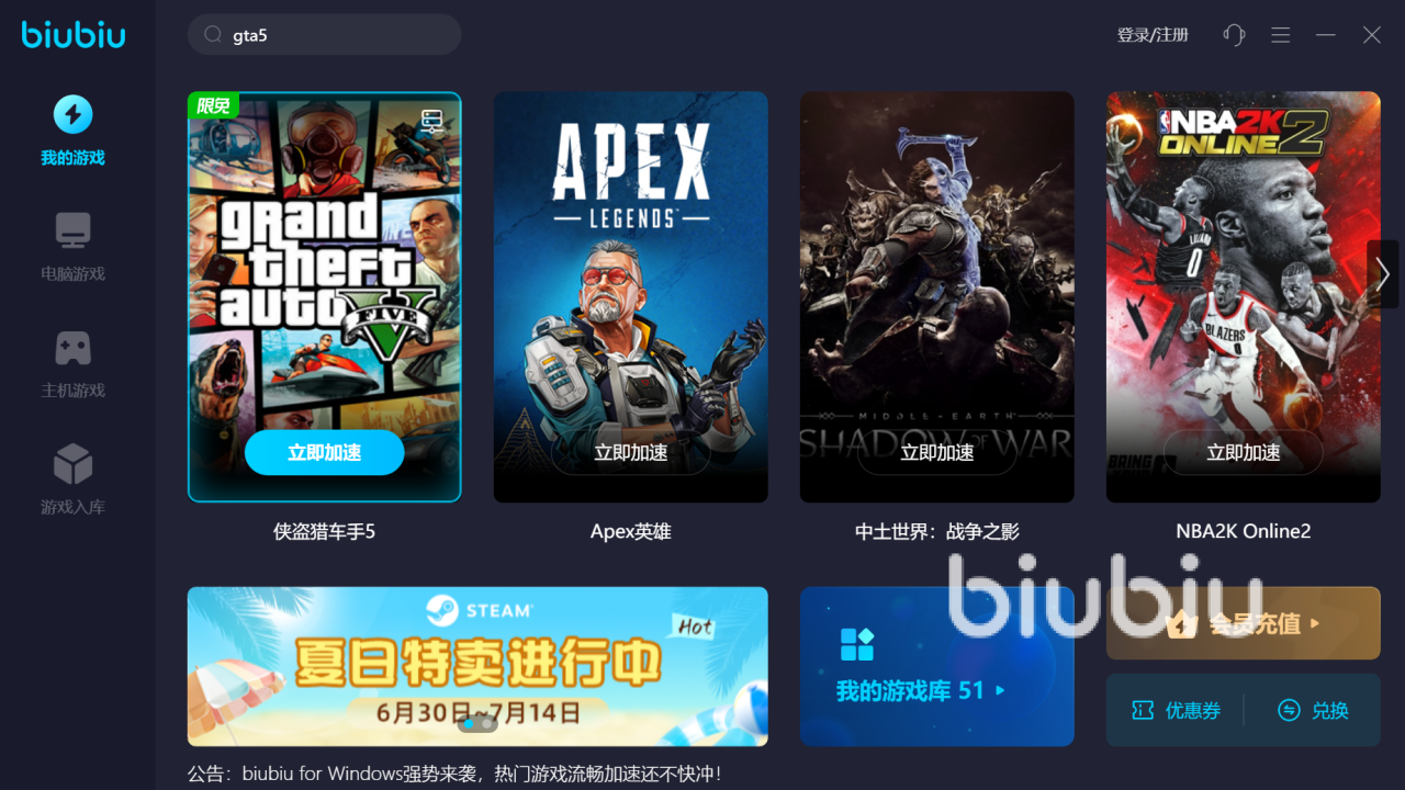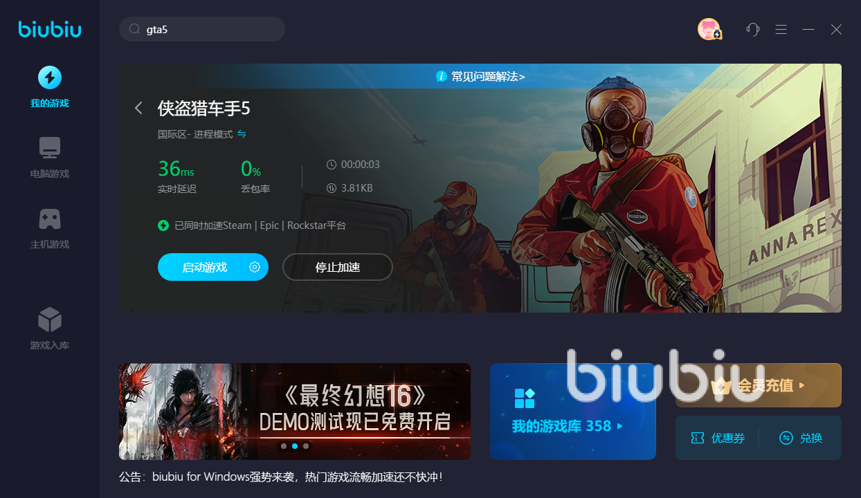 该加速器覆盖全球过个节点,根据你当下的网络环境会智能的帮你连接最适合的节点跟线路,让你的游戏运行更加的稳定。初次下载的用户就会领取到3天vip会员试用福利,完成注册登录进入首页面编辑侠盗猎车手5游戏名称就可以看到,你可以直接启动加速,或者将游戏添加到我的加速列表里边,这样第二次使用的时候就不需要再进行搜索了。