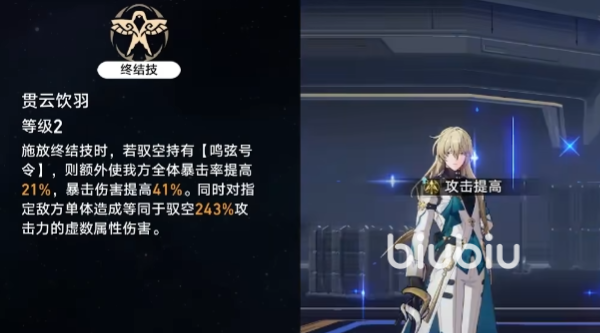 终结技贯云饮羽的主体是一次高倍率的单体攻击,而增加双爆的效果需要释放终结技时,持有鸣弦号令才能生效。增加的双爆和攻击力效果绑定,当鸣弦号令消失时,增加的双爆效果也会消失。在没有星魂六之前,需要释放战技之后再使用终结技。