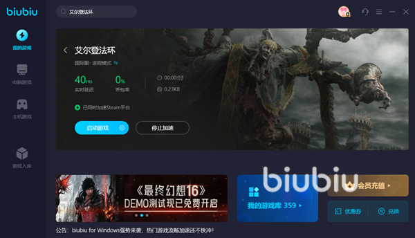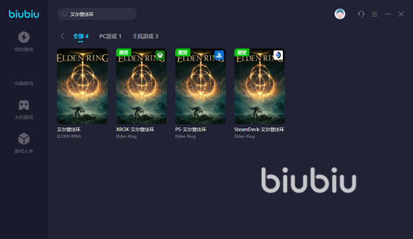 想要使用biubiu加速某款游戏,直接在平台中搜索就可以了。如果你在软件中搜索艾尔登法环,会发现这款软件中支持的平台版本非常多,除了比较主流的PC版本外,甚至还可以免费为PS、XBOX等进行加速,在最近的版本更新中还加入了SteamDeck掌机版本的支持,可以看出实力真的很强大,真的是太给力了。