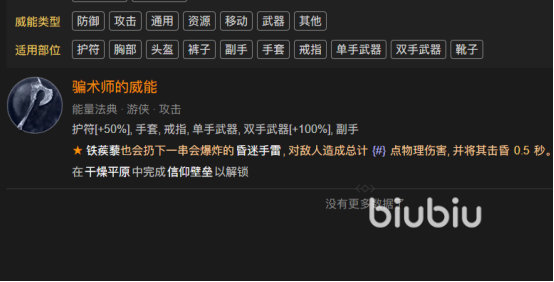 首先,我们要了解昏迷手雷是骗术师的威能。这个威能可以在干燥平原完成信仰壁垒获得。主要是增加铁蒺藜技能的伤害,当我们使用这个技能时,同时会在地上留下爆炸的昏迷手雷,并且提供控制效果,让敌人眩晕0.5秒。