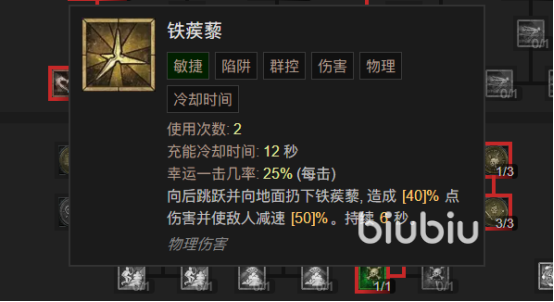 而铁蒺藜是游侠职业的敏捷技能,可以理解为游侠的位移技能,该技能可以让玩家向后跳跃并且在地上撒下铁蒺藜,造成敌人减速。除了铁蒺藜这个位移技能,游侠还有不可阻挡的暗影步和冲向敌人造成劈砍的疾行斩,这两个位移技能。