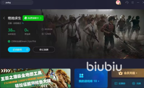 登录之后输入绝地求生,游戏搜索出之后,点击立即获取以及立即加速,即可完成加速操作。之所以小编极力为大家推荐这一款加速器,正是由于biubiu拥有众多实用功能,可轻松解决各种小问题,比如闪退、掉线、不流畅、延迟等等。尤其是战斗时画面以及声音都特别清晰,可通过敌人的脚步以及枪械声音,清楚的辨别敌人所在的方向。游戏结束之后,加速器会自动关闭,并不会影响其他软件的运行。