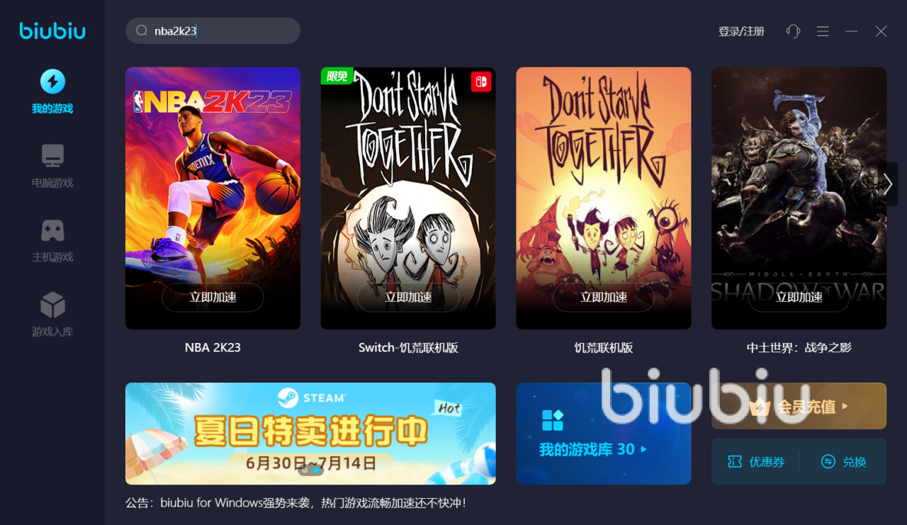 biubiu收费透明公开,新人直接享受三天免费福利,然后第一次充值四折优惠,每月最低十元起,实现海量国内外端游加速,从此告别游戏卡顿、闪退的烦恼,尽情畅游网游世界。这一软件还推出限时活动,为XBOX、SWITCH、STEAM等主机游戏免费加速。
