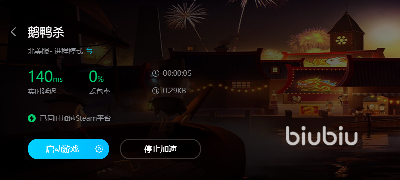 第三步,为鹅鸭杀加速。biubiu端游版本使用方法类似,玩家通过搜索游戏名称跳转到专区中,选择服务器和模式,为外服游戏加速。它关闭加速方式也相同,玩家们点击停止加速即可。